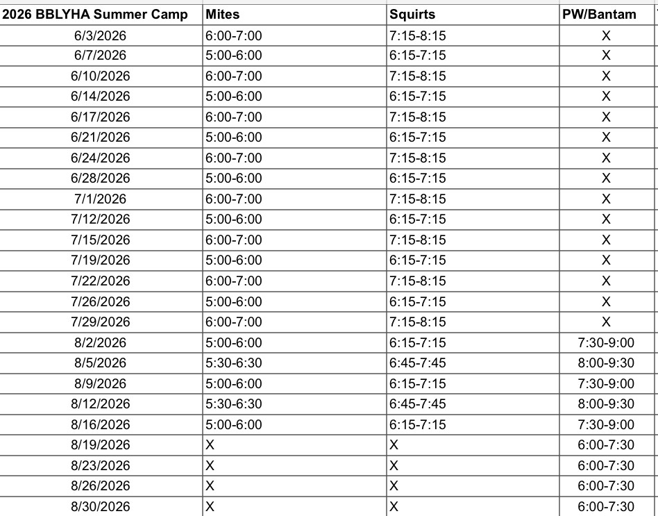 Mites/Squirts - Sundays and Wednesdays from June 3rd through August 16th (no camp the week of July 4th)